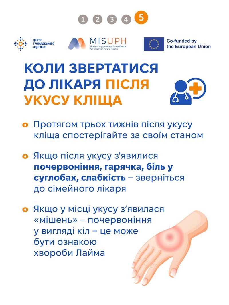 Хвороба Лайма може починатися з почервоніння на місці укусу кліща, схоже на мішень (червоні кола), головного болю, млявості, болю в тілі. Якщо її не лікувати на ранній стадії — це може призвести до ураження шкіри, суглобів, серця, нервової системи й навіть до інвалідності.