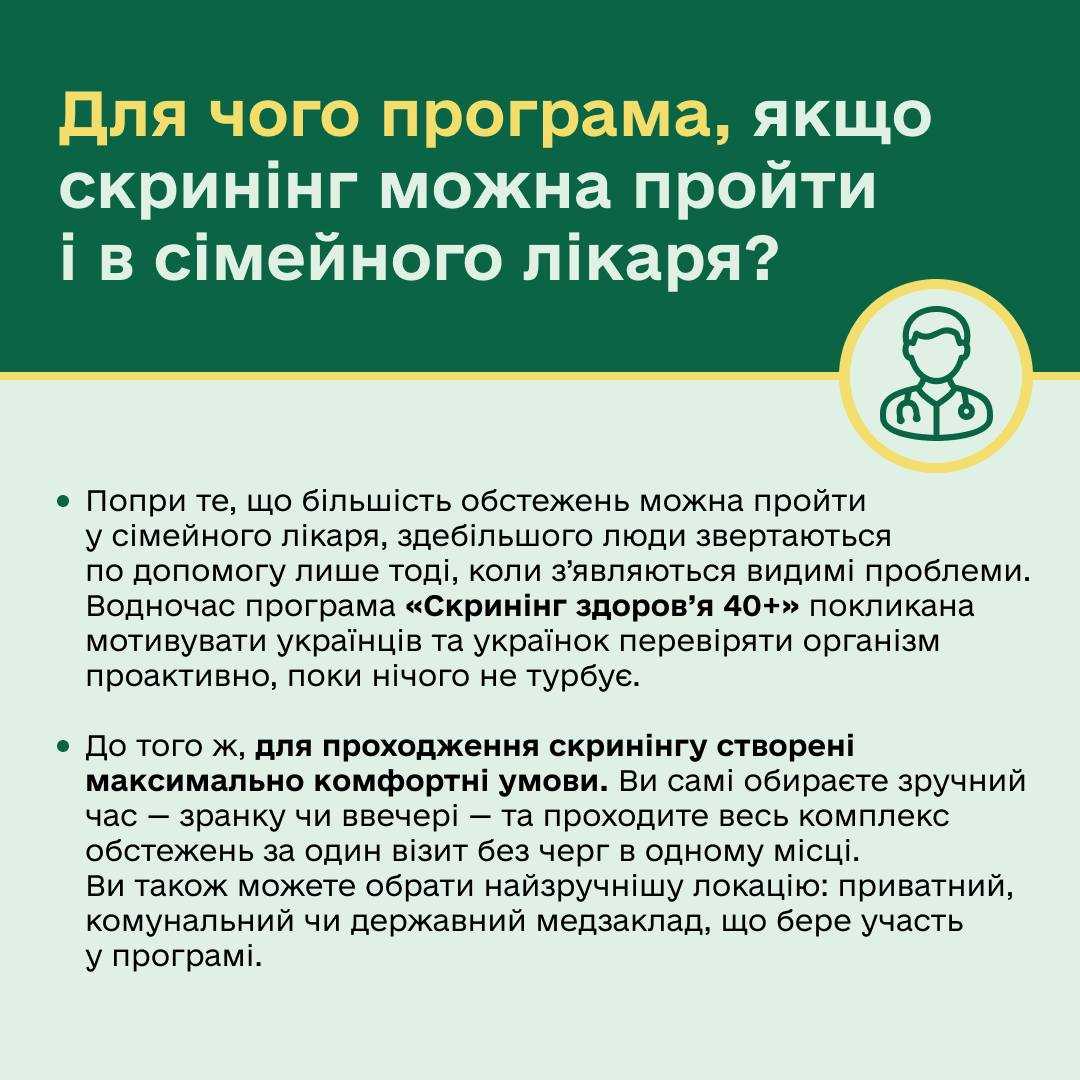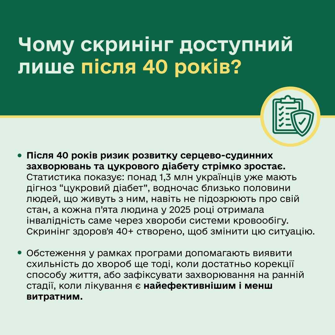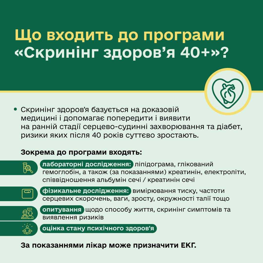 «Скринінг здоров’я 40+» — це програма раннього виявлення серцево-судинних захворювань, цукрового діабету та розладів психічного здоров’я, яка стартувала в Україні на початку 2026 року.